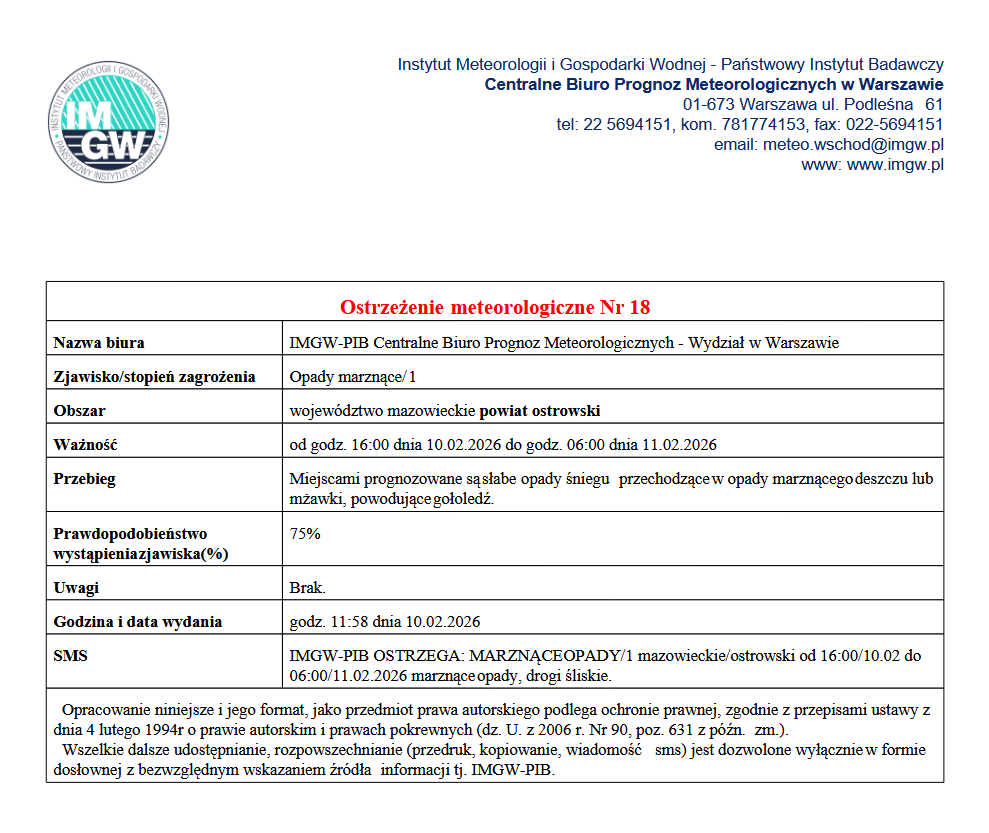 Ostrzeżenie meteorologiczne Nr 18 - Opady marznące - 10.02.2026