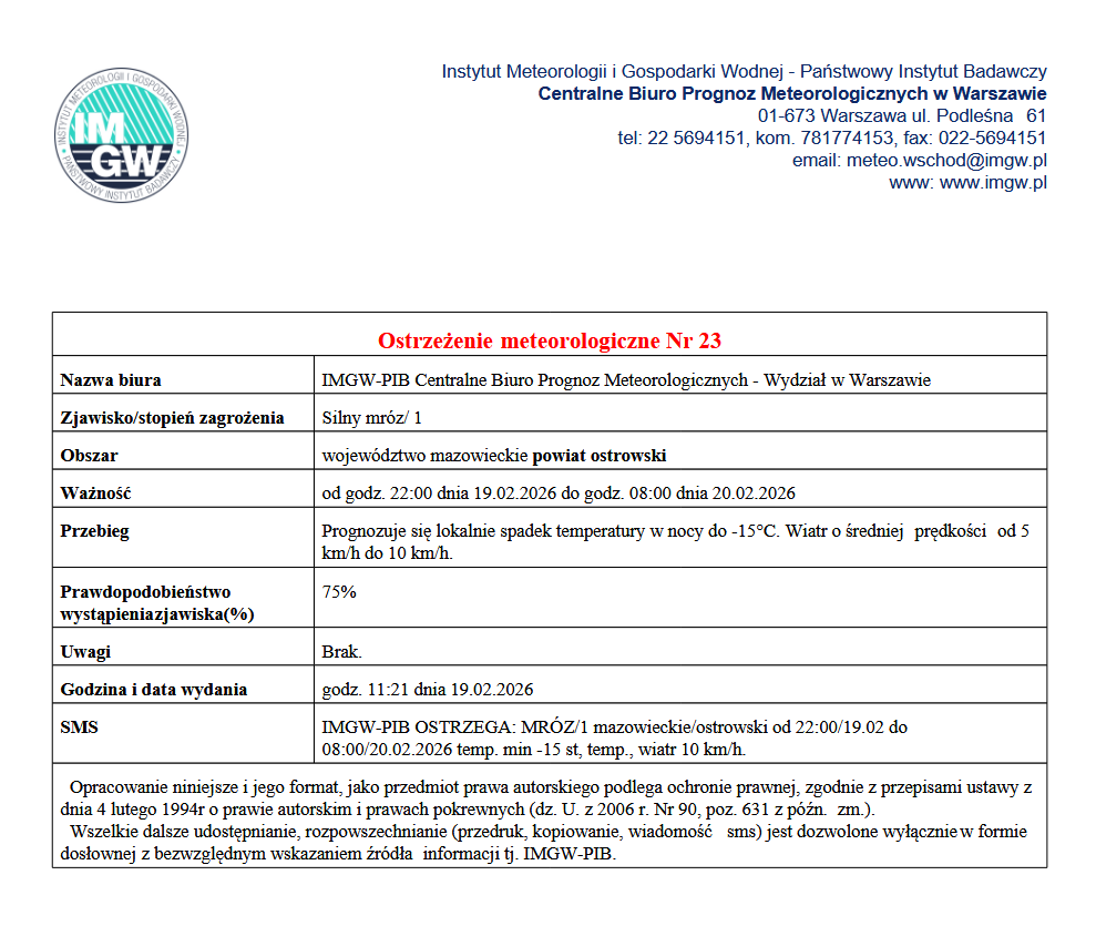 Ostrzeżenie meteorologiczne Nr 23 - Silny mróz - 19.02.2026