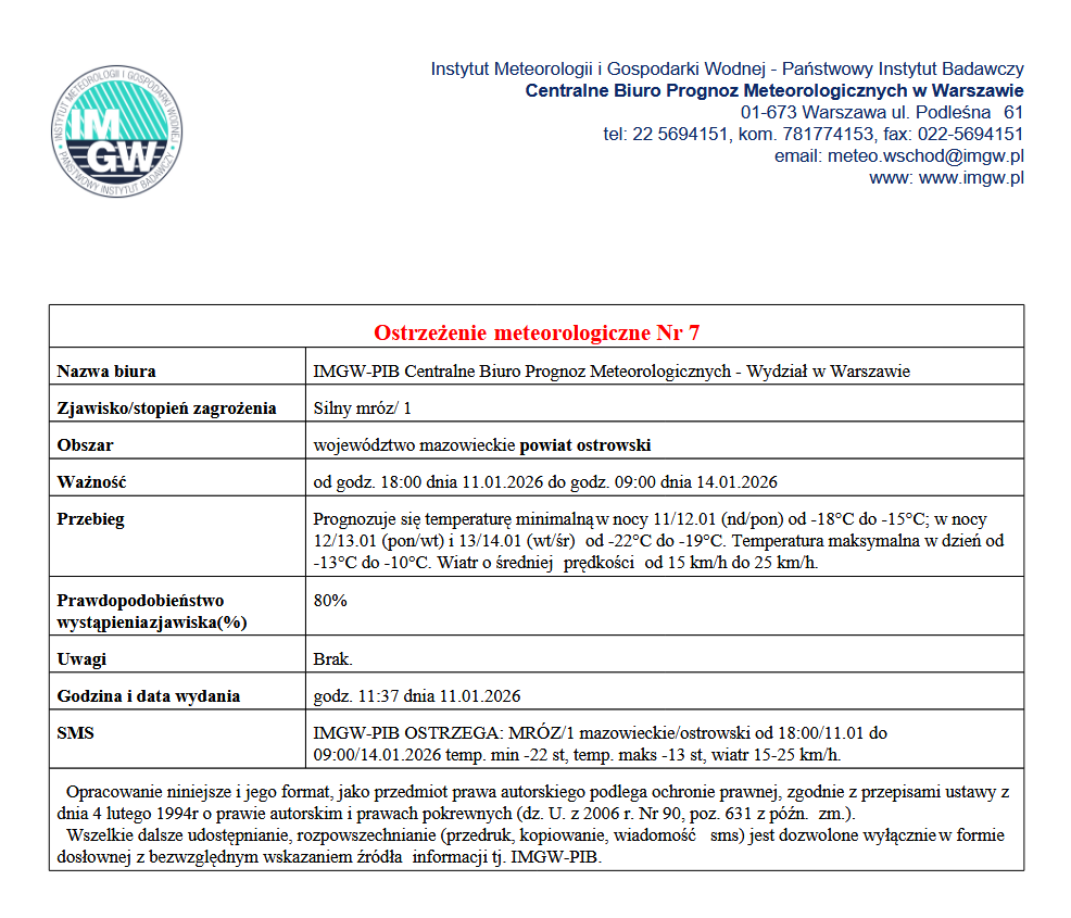 Ostrzeżenie meteorologiczne Nr 7 - Silny mróz - 11.01.2026