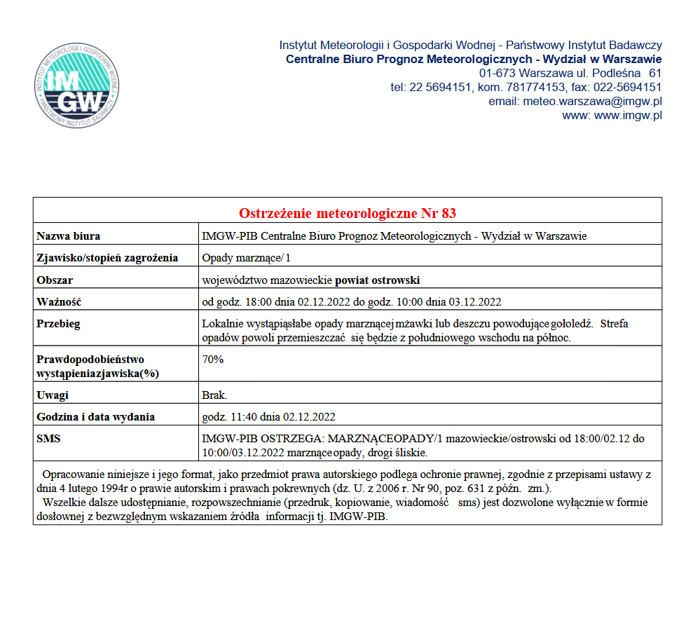 Ostrzeżenie meteorologiczne Nr 83 - Opady marznące - 02.12.2022