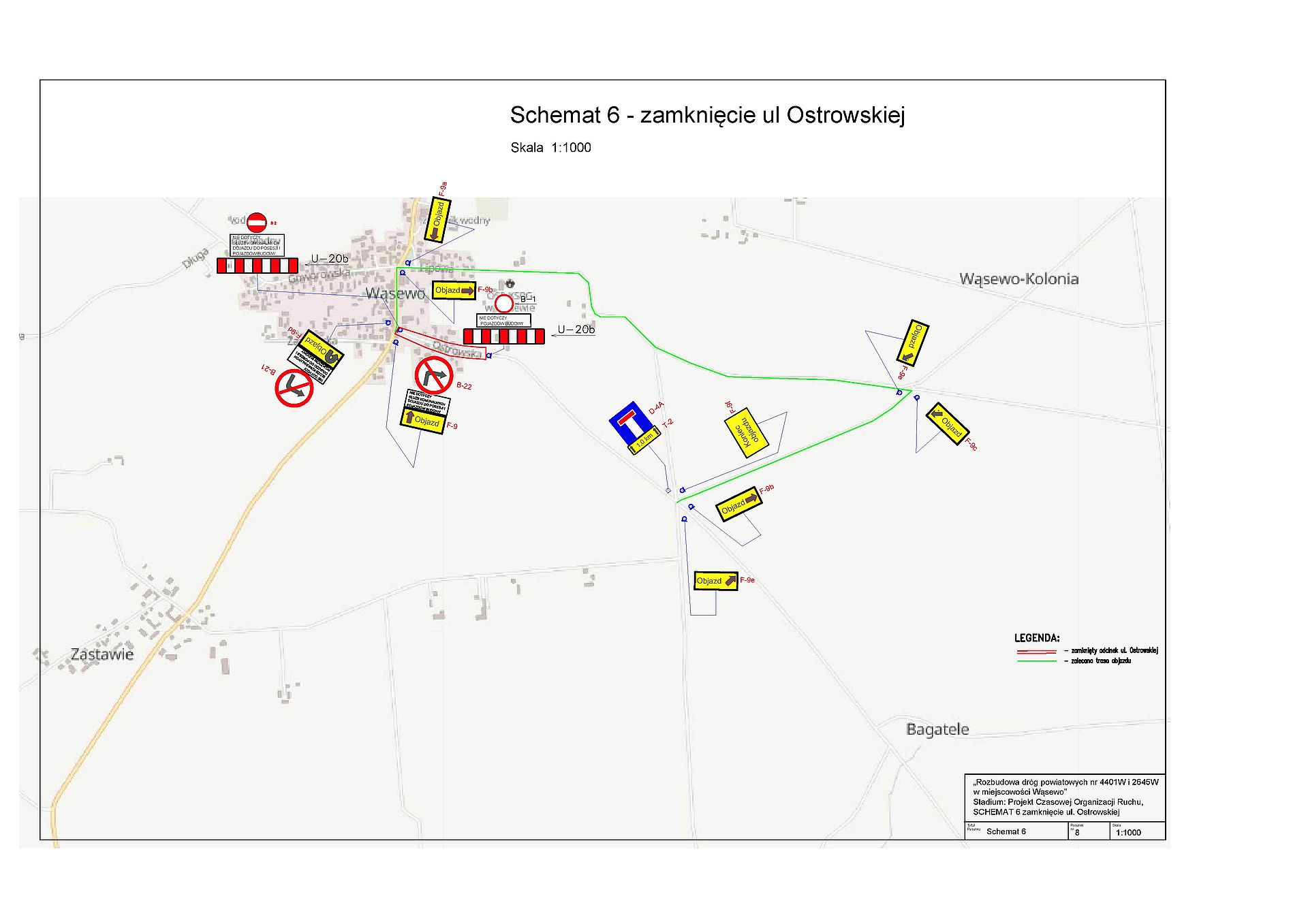 W związku z Rozbudową dróg powiatowych nr 4401W i 2645W w miejscowości Wąsewo, wykonawca ww. zadania informuje o planowanym wprowadzeniu zmiany czasowej organizacji ruchu - zamknięcie ul. Ostrowskiej.