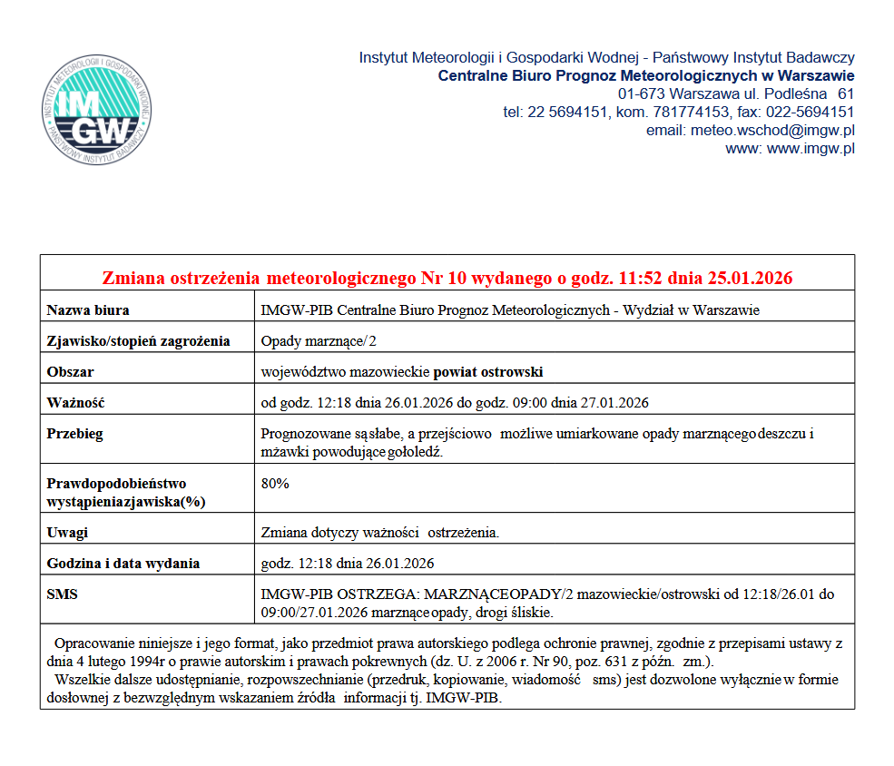 Zmiana ostrzeżenia meteorologicznego Nr 10 wydanego o godz. 11:52 dnia 25.01.2026
